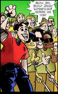 Among the thousands of delighted youngsters cheering him on is Bix's faithful boy companion, Dicky Daniels.